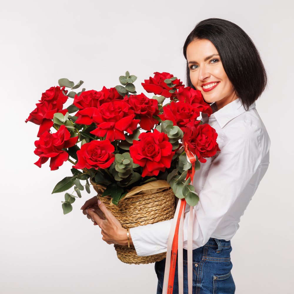 Klasický symbol lásky v modernom prírodnom štýle. Bohatý kôš plný vášnivých červených ruží doplnený sviežim eukalyptom je dar, ktorý zanechá dojem.