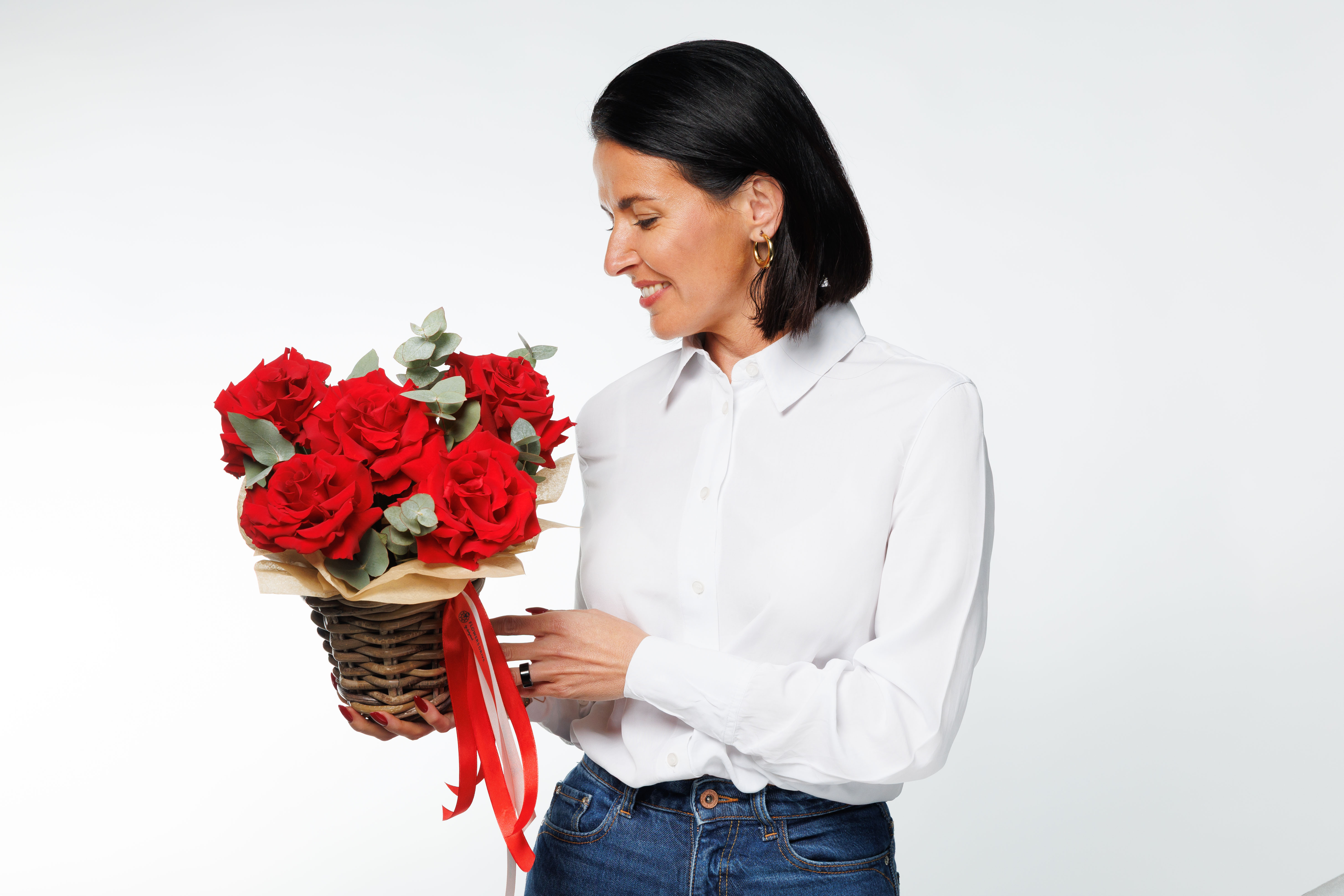 Elegantný kvetinový kôš plný francúzskych červených ruží ako symbol vďaky, lásky a úcty.